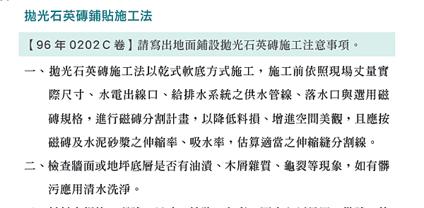 就是說,提到類似工項的相似工序,比方說磁磚鋪貼分為硬底、軟底,地面與牆面,但不論是哪一種,都需要預先「放樣」、「清理表面」,其中的「清理表面」就可以整理成都是一模一樣的敘述方式,才會好記,不論出題如何出,只要是磁磚鋪貼的「表面清理」都可以用一樣的敘述來應付,讀書節省相當多的時間!