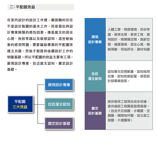 因此,本書所要交代的「平面配置標準流程」顯然不只是「住得舒服」的一套專業知識,而是可以折服屋主、順利簽約、減少施工錯誤、免除裝修糾紛、輕鬆收取尾款的一套專業知識。
