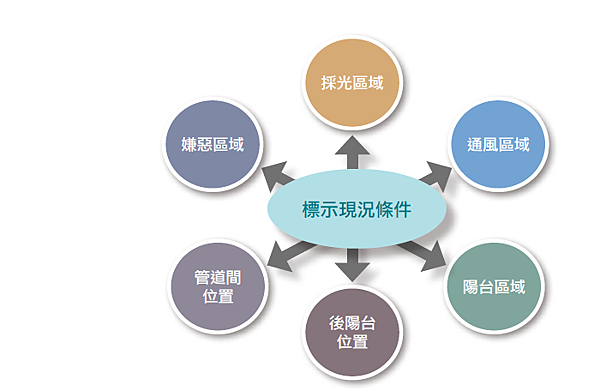 將案主物件的內外條件與現況標示清楚,就能依照現況條件的差異進行改善補強的設計工作,發揮設計師的專業,如改善日照不足、機械換氣設備補強、正確分配空間、改善嫌惡設施影響等。